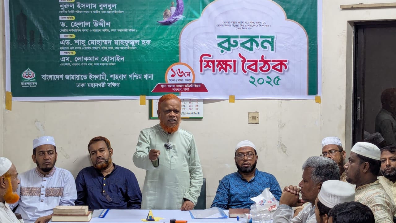 বাংলাদেশ জামায়াতে ইসলামী শাহবাগ পশ্চিম থানার রুকন শিক্ষা বৈঠক শুক্রবার (১৬ মে) অনুষ্ঠিত হয়েছে। থানা আমীর এডভোকেট শাহ মো. মাহফুজুল হকের সভাপতিত্বে অনুষ্ঠিত রুকন শিক্ষা বৈঠকে প্রধান অতিথি হিসেবে উপস্থিত ছিলেন বাংলাদেশ জামায়াতে ইসলামীর কেন্দ্রীয় নির্বাহী পরিষদের সদস্য ও ঢাকা মহানগরী দক্ষিণের আমীর জননেতা মো. নূরুল ইসলাম বুলবুল।
