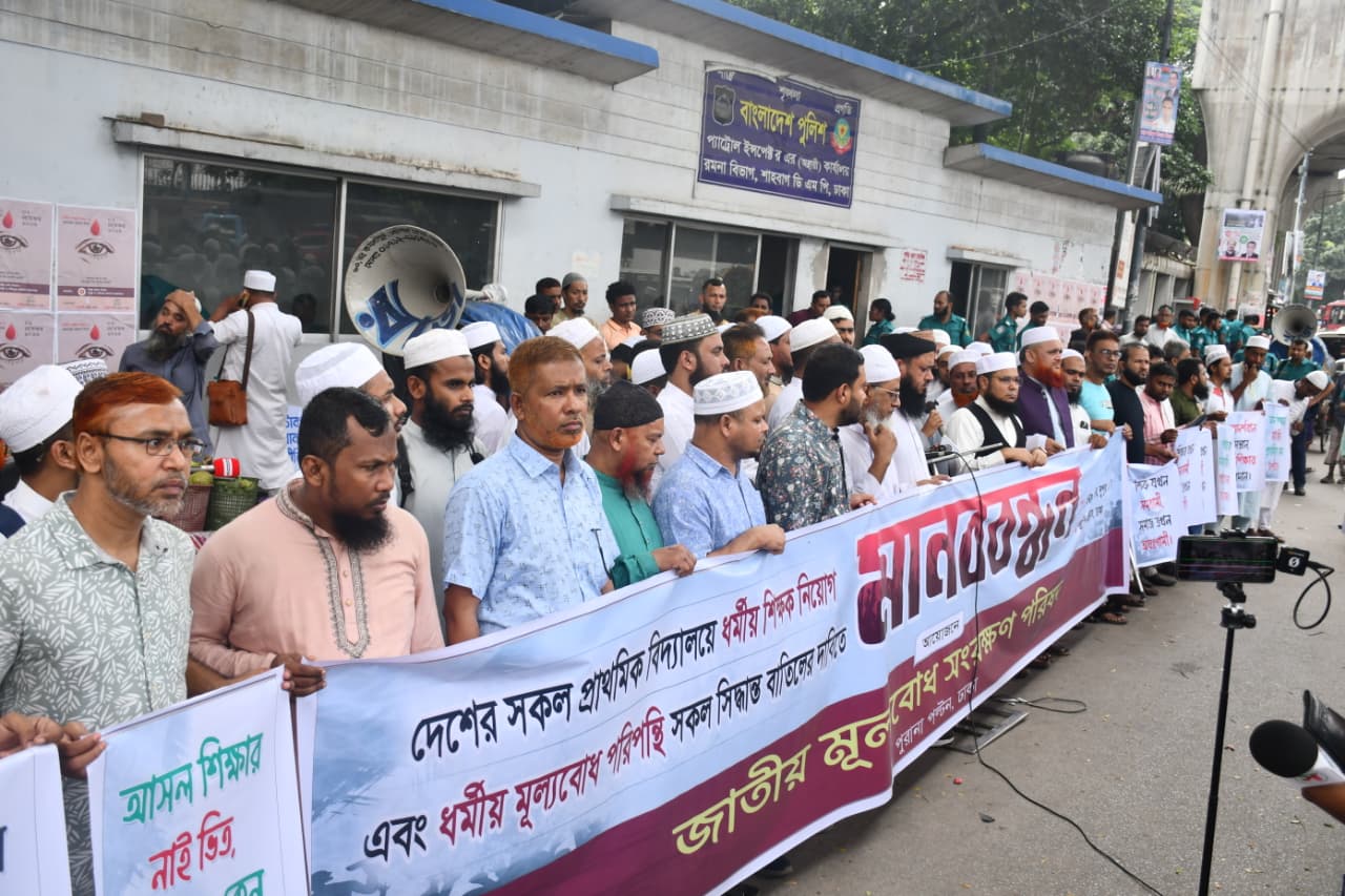 প্রাথমিক বিদ্যালয়ে ধর্মীয় শিক্ষক নিয়োগ এবং ধর্মীয় মূল্যবোধবিরোধী সকল সিদ্ধান্ত বাতিলের দাবিতে জাতীয় মূল্যবোধ সংরক্ষণ পরিষদের মানববন্ধন