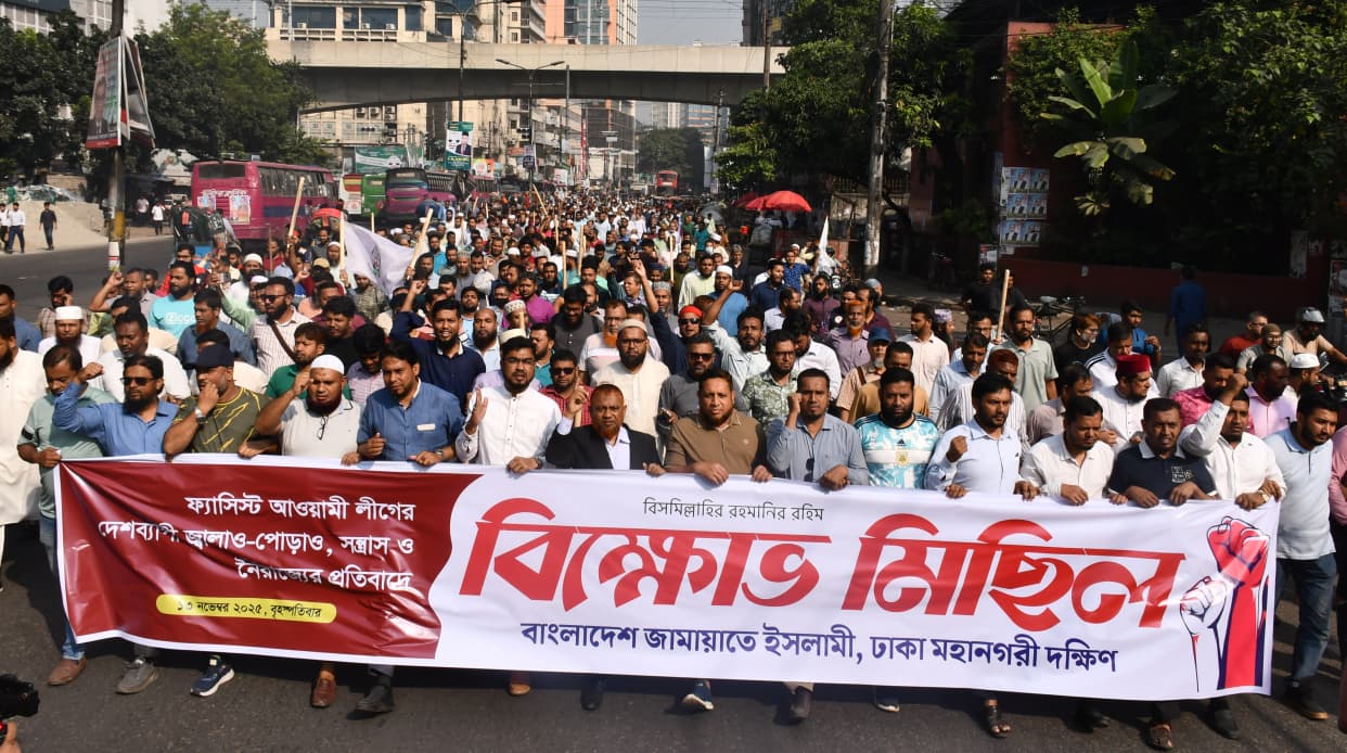 দেশব্যাপী ফ্যাসিস্ট আওয়ামী লীগের জ্বালাও-পোড়াও, সন্ত্রাস ও নৈরাজ্যের প্রতিবাদে বাংলাদেশ জামায়াতে ইসলামী ঢাকা মহানগরী দক্ষিণের উদ্যোগে বৃহস্পতিবার (১৩ নভেম্বর) সকালে পল্টন-গুলিস্তান জিরো পয়েন্ট-প্রেস ক্লাব এলাকায় বিক্ষোভ মিছিল শেষে বায়তুল মোকাররমের উত্তর গেইটে এক প্রতিবাদ সমাবেশ অনুষ্ঠিত হয়।