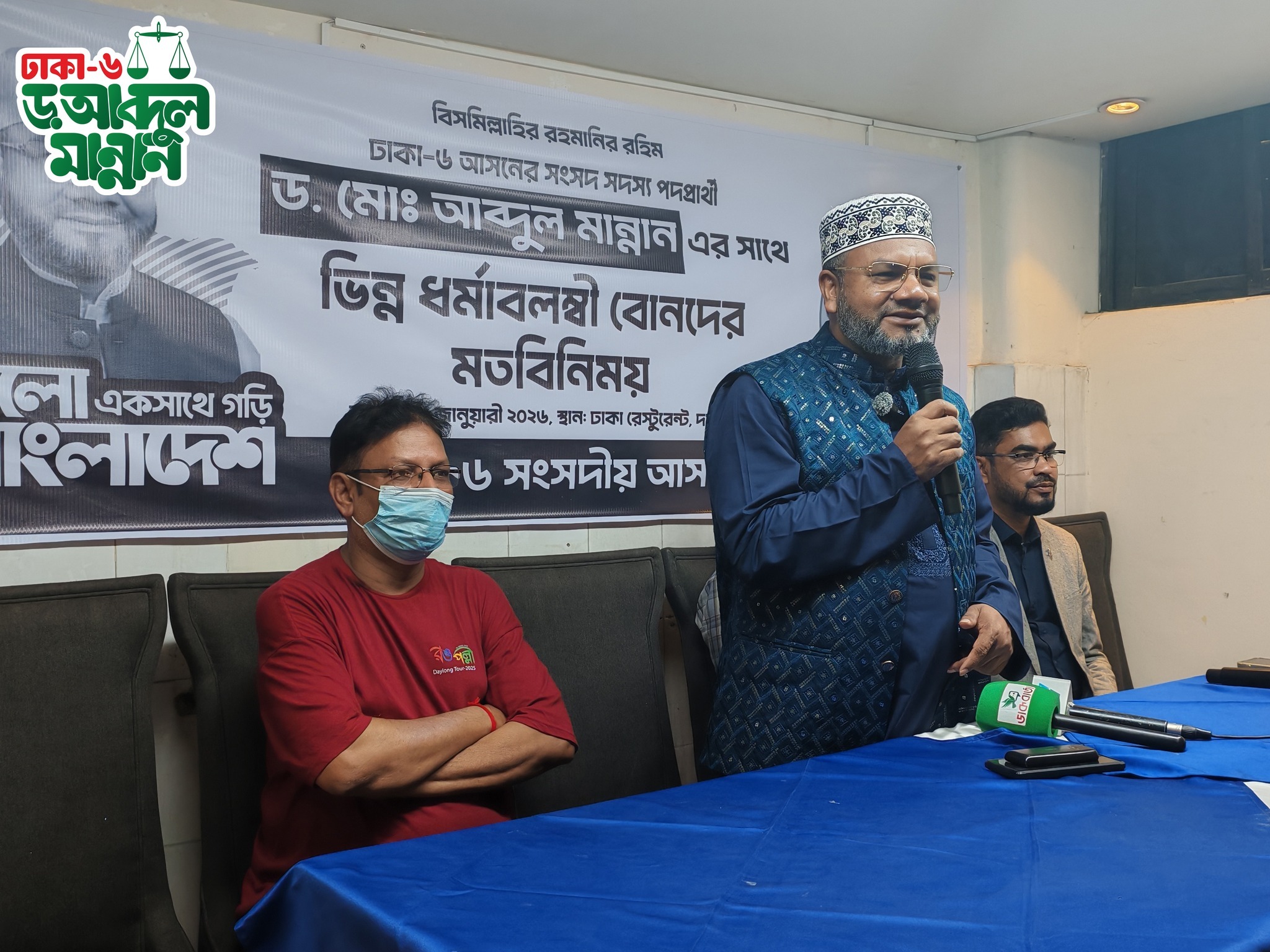 ঢাকা-৬ আসনের সংসদ সদস্য পদপ্রার্থী ড. মুহাম্মাদ আব্দুল মান্নান বলেছেন, ধর্মের ভিত্তিতে কোনো বৈষম্য নয় এমন একটি সম্প্রীতির বাংলাদেশ গড়াই আমাদের লক্ষ্য। প্রতিটি নাগরিকের অধিকার রক্ষা করা রাষ্ট্রের নৈতিক দায়িত্ব।